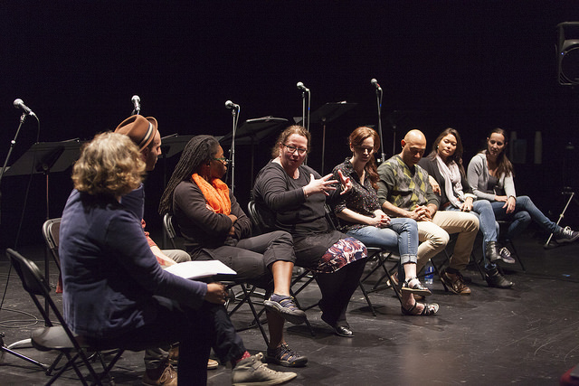 Our post-presentation discussion: Pictured left to right: Jeannie O’Hare (Head of Playwriting, Yale Drama), Gabe Levey, Donnetta Lavina Grays, me, Margot Bordelon (Director), Andrew Guilarte, K K Moggie, Mariko Nakasone. Not in the picture: Palmer Hefferan (Sound designer).