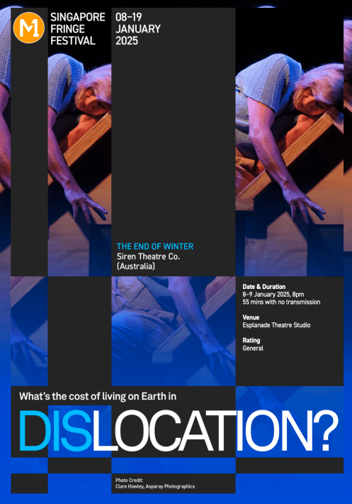 The End of Winter goes international. Siren’s production, directed by Kate Gaul and performed by Jane Phegan, is part of the 2025 Singapore Fringe Festival in January. It’s at the Esplanade Theatre—should you be in Singapore—and is part of an exciting program of local (i.e. Singaporean) and international work. More details here.
